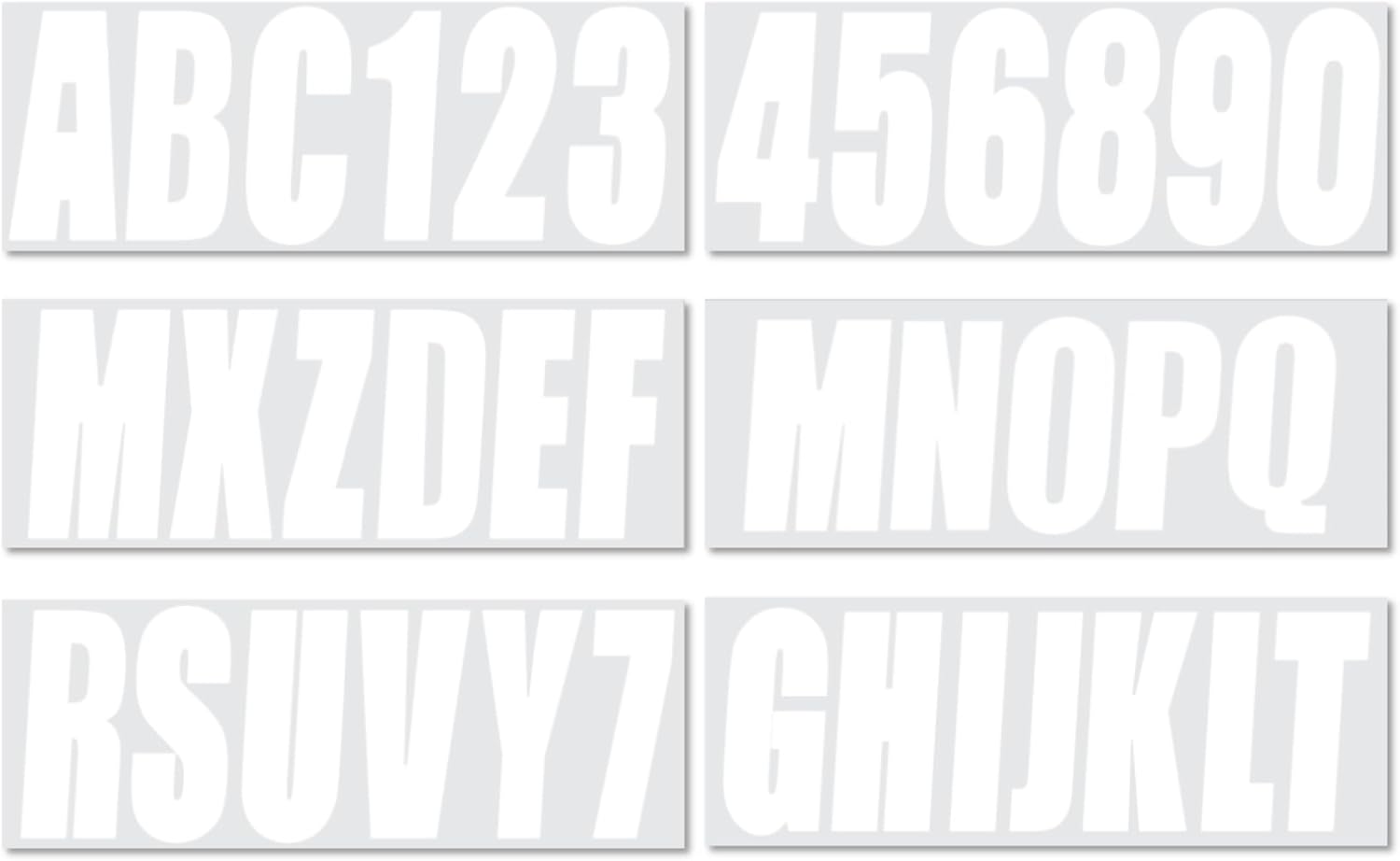 3 Inch Registration Decal Sticker kit for boats and power watercraft vehicles, includes four sets of A-Z and four sets of 0-9 - White is backordered and will ship as soon as it is back in stock.